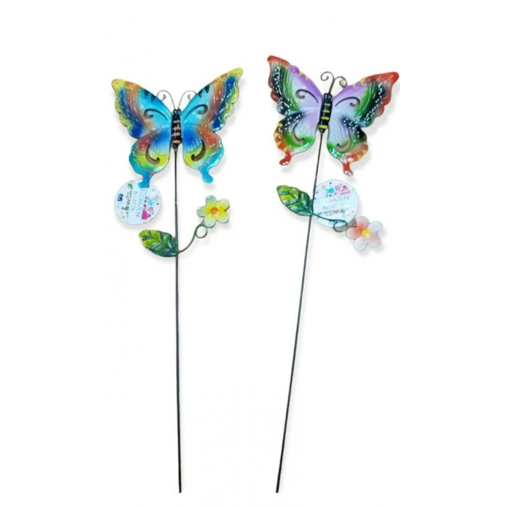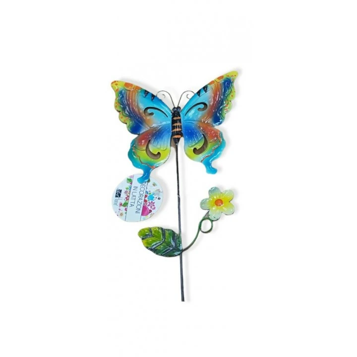 2 farfalle colorate in latta con spillone, perfette da infilare nei vasi del terrazzo, giardino o casa