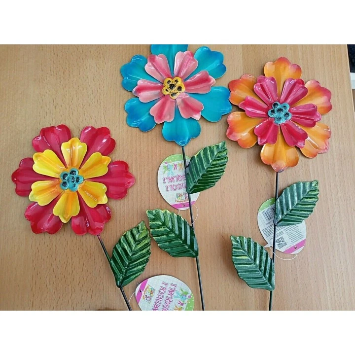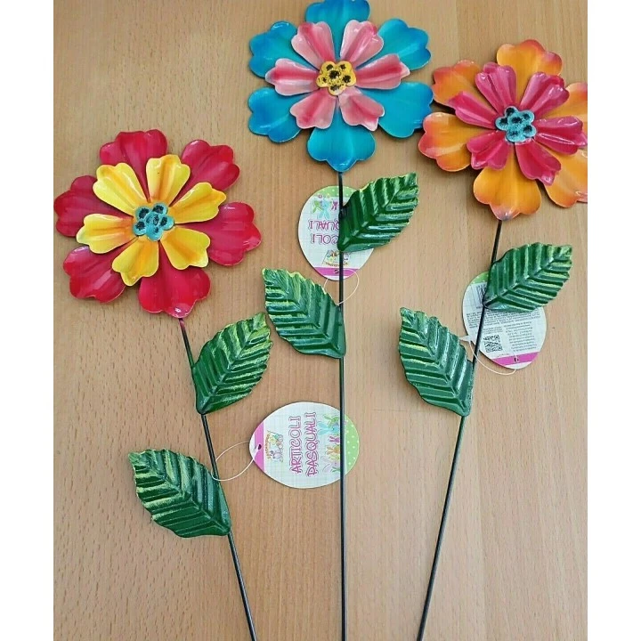 3 fiori colorati in latta con spillone, perfette da infilare nei vasi del terrazzo, giardino o casa