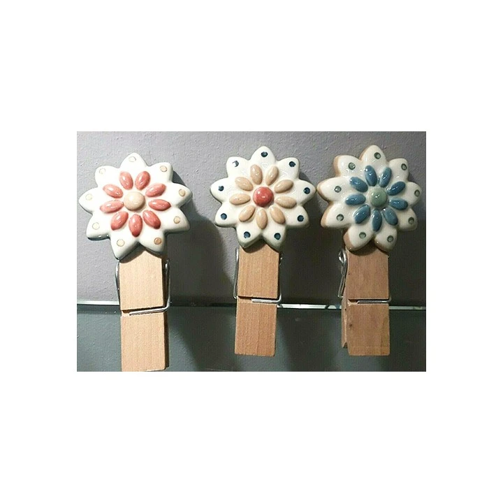 Tris mollette/pinze chiudi-pacco in legno con applicazione Wald in ceramica, linea “Felice Nostalgia”