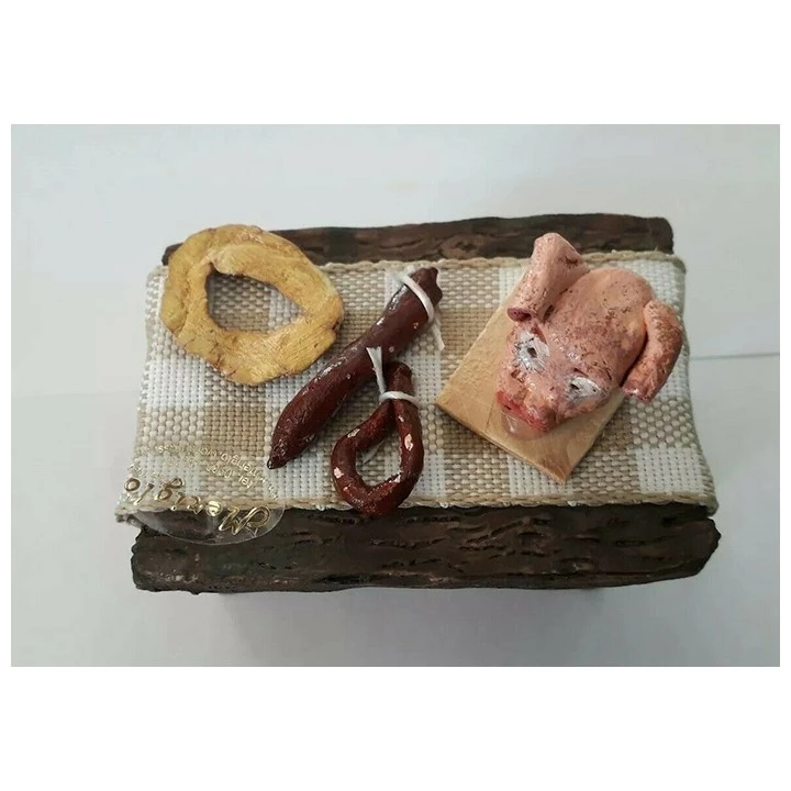 Tavolino in resina apparecchiato con tovaglia beige a quadretti bianco, con salumi e testa maiale realizzati a mano in terracotta dipinta