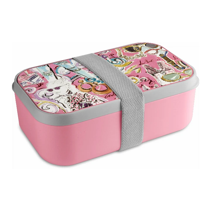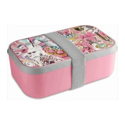 Comodo contenitore decorato dotato di: divisorio centrale rimovibile per il trasporto di due diverse pietanze, set di posate nell’apposito ripiano intermedio, chiusura ermetica che permette il trasporto in piena sicurezza del pranzo senza fuoriuscite.