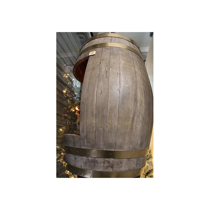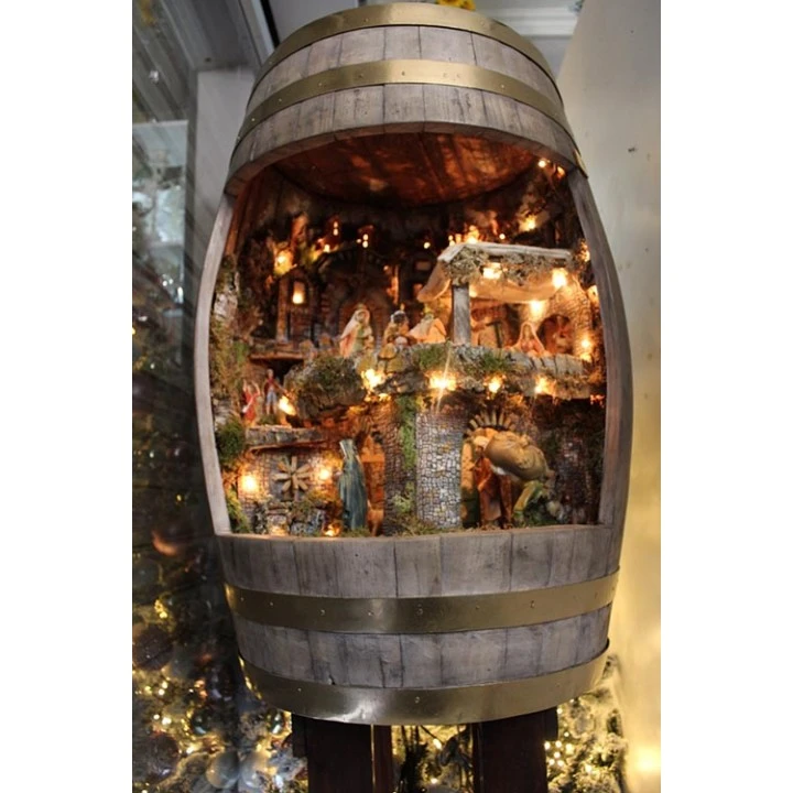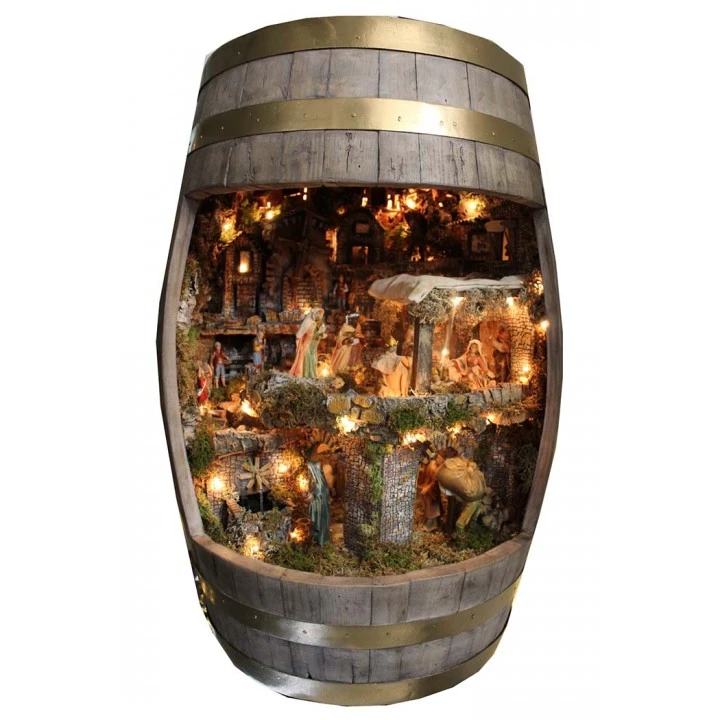Manufatto realizzato in una vecchia botte in legno di rovere antichizzato. Il presepe è realizzato su più livelli di profondità e altezza con Mulino a vento, fuoco e fontana funzionante, illuminato con 100 lucine a luce calda.