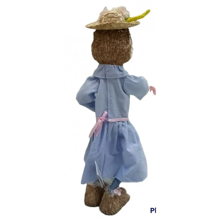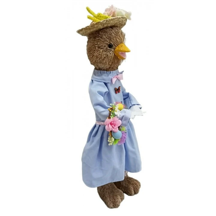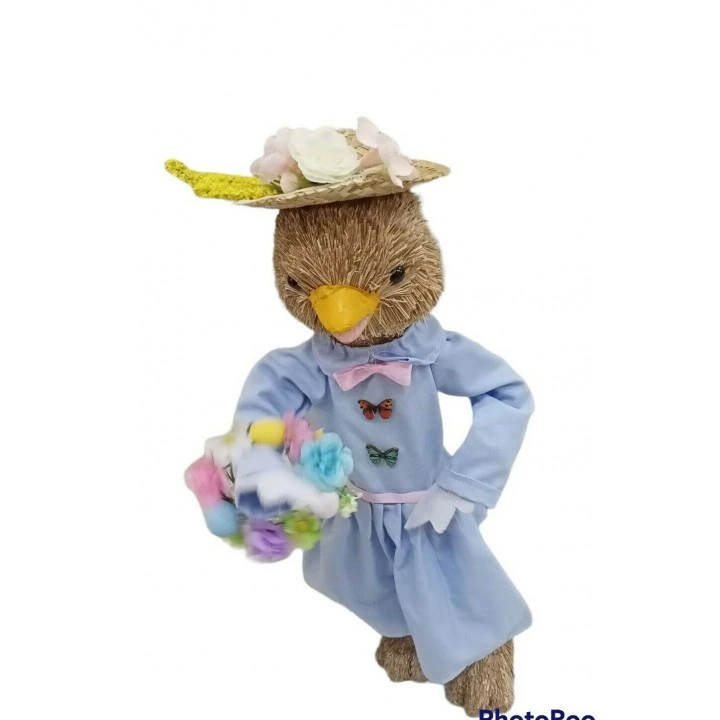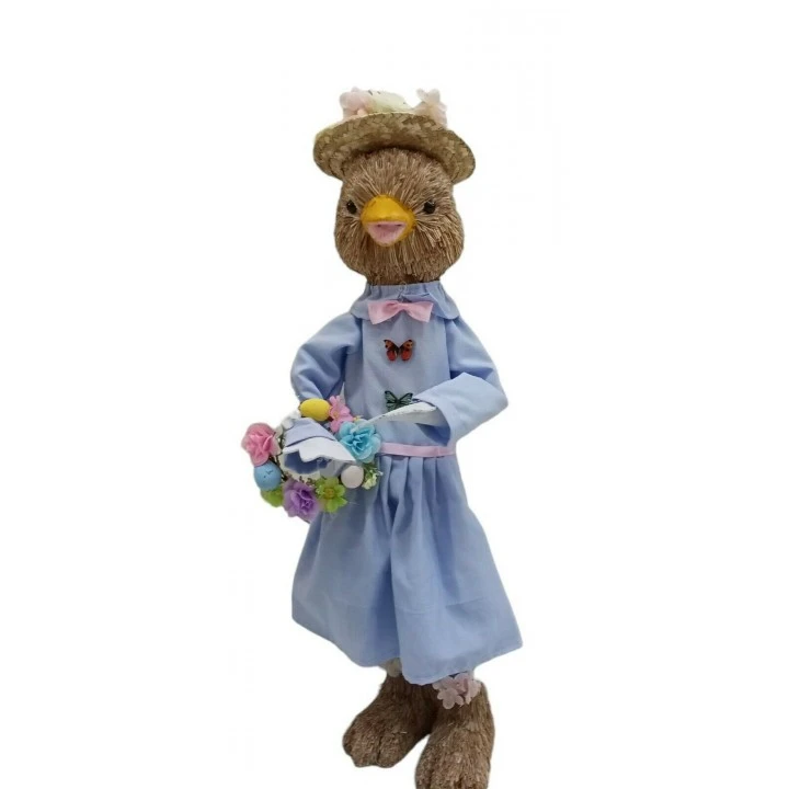 Pupazzo pasquale Pulcino realizzato in polistirolo e paglia con vestiti in tessuto, cappellino di paglia con fiorellini sintetici.