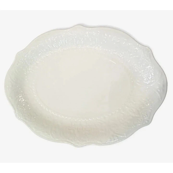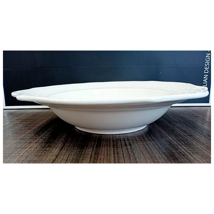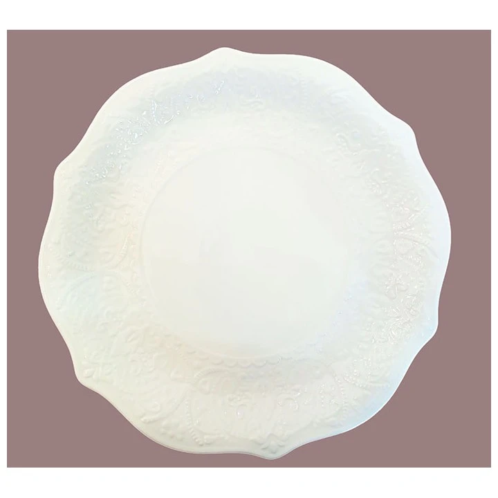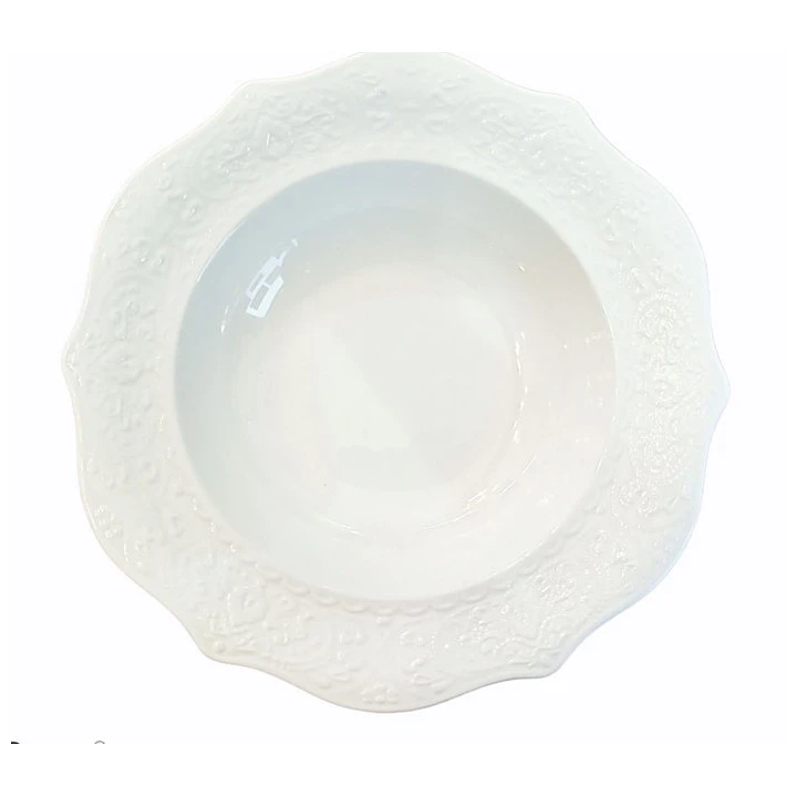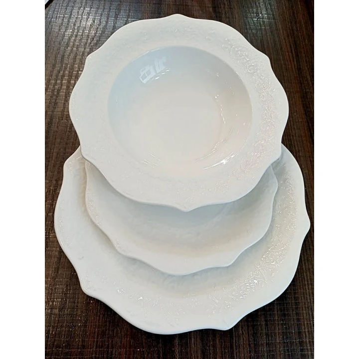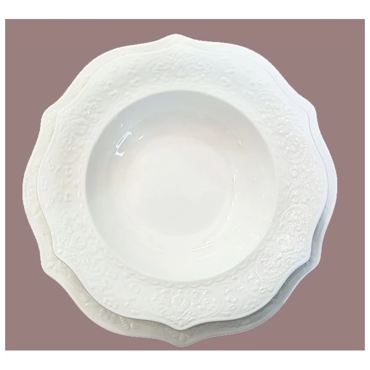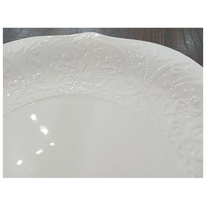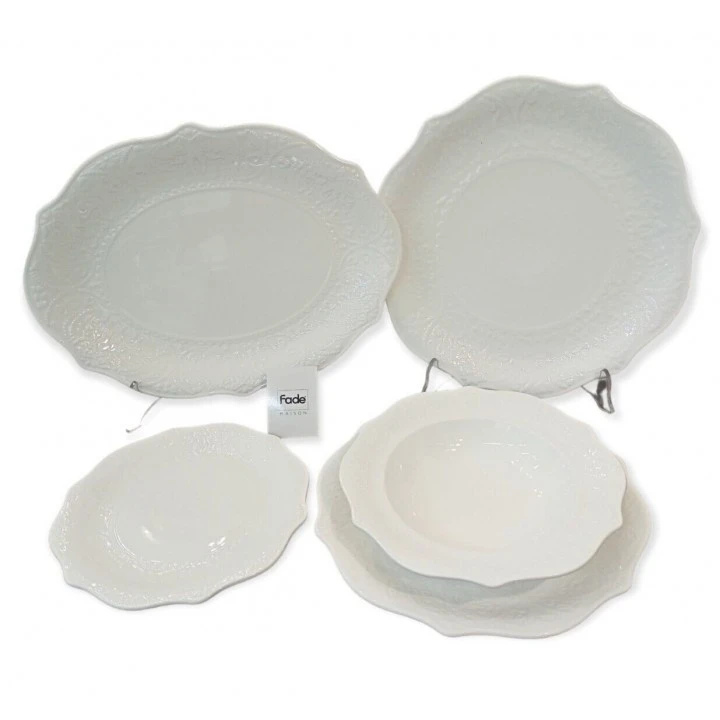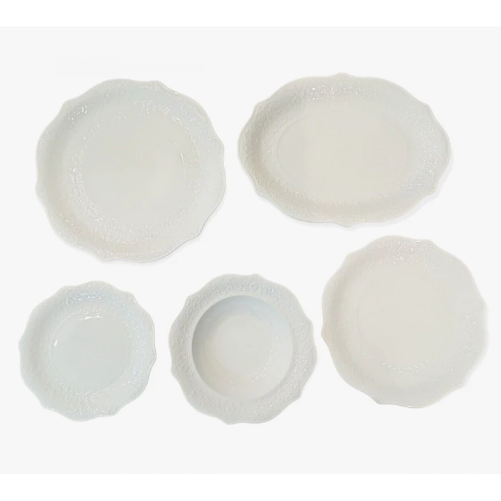 Raffinato servizio di piatti da 38 pezzi, elegante e contemporaneo grazie ai suoi bordi festonati e al decoro bianco tono su tono in rilievo di rivisitazione barocca. Adatto ad una tavola classica ma anche contemporanea grazie al suo look total white, ideale per le tavole dei giorni di festa, perfetto da coordinare con diversi tovagliati e sottopiatti per mise en place uniche e differenti