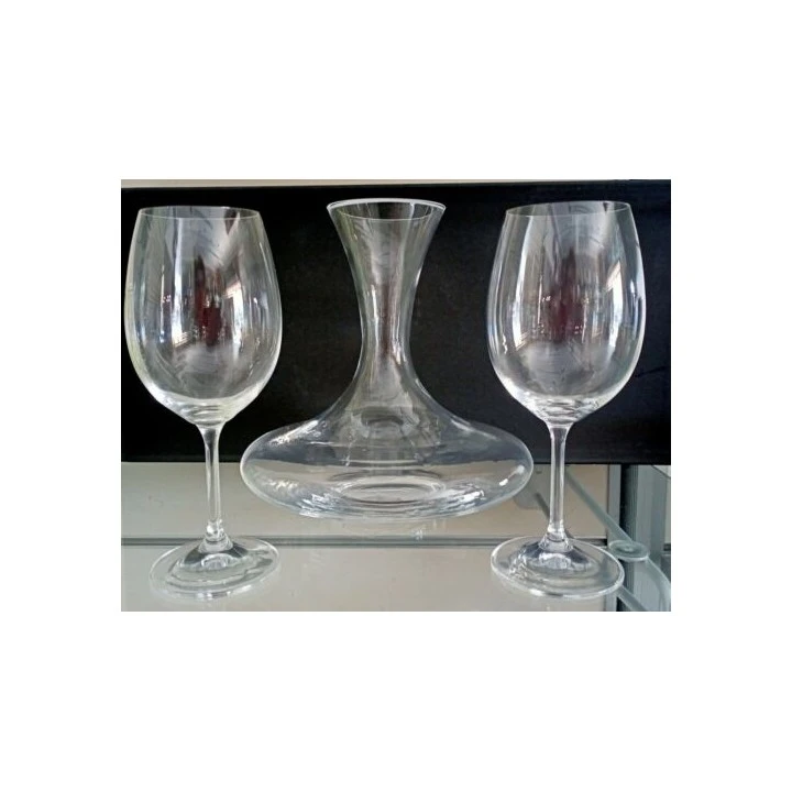 dimensioni: Calici= h21cm Ø 6,5cm – Capacità: 350 ml; Decanter h22cm Ø22cm – Capacità 1,35cl